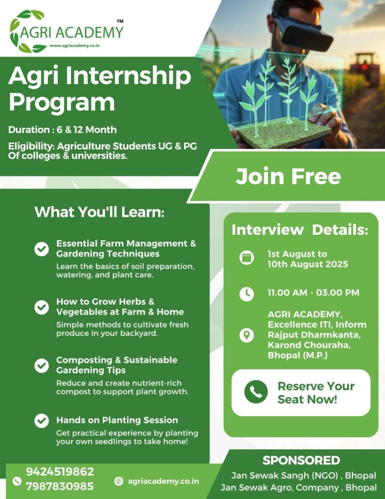 एग्री अकादमी, भोपाल के विद्यार्थियों को कृषि के क्षेत्र में इंटर्नशिप करने का मौका दे रही है, JS, Group को विगत वर्ष 2026-27-28 के लिये योग्य व अनुभवी, कार्यकर्ताओं की आवश्यकता है | JS, Group ने भोपाल संभाग स्तर कर कृषि के क्षेत्र में कई परियोजनओं की शुरुआत की है, जिसमे अंगे चल कर अनुभवी व योग्य विद्यार्थियों को इस परियोजनओं का संचालन व प्रबंधन करने का अवसर प्रदान किया जाएगा |